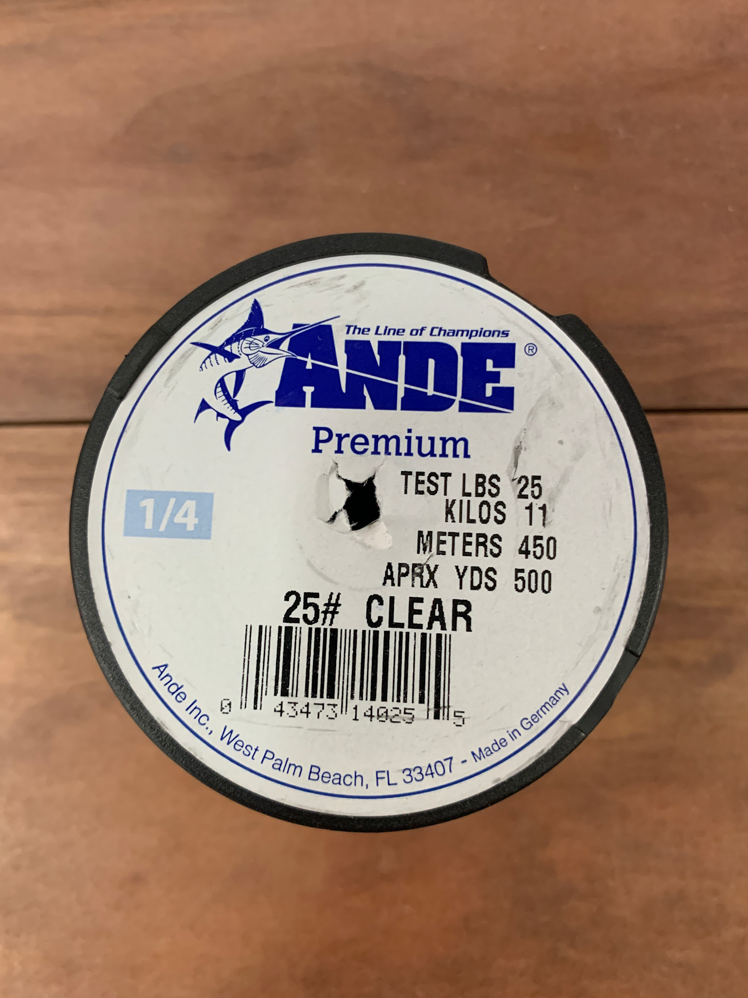 ANDE Premium monofilament is our standard production monofilament and is perfect for the vast majority of anglers. It is a medium-soft monofilament with excellent tensile and knot strength and it is very abrasion resistant. The Premium monofilament comes in clear or pink and is available in tests from 2 to 400 pound